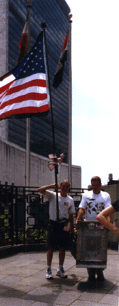 Fearing complaints about the "environmental correctness of a Butterfly release at Robert Moses Park, a playground with no grass, it was suggested that Dag Hammarskjold Park would be a better place. The event was previously scheduled for 2 P.M., Monday, June 23, 1997, but was moved to Thursday because of the Presidential visit. Participants included Alan Moore, founder of the BGA, Trina Paulus, author of Hope for the Flowers; George Ripley, founder of Environmental Patriots Inc., carrying a giant American flag with a green fringe; two butterfly dancers, and musicians. The butterflies were released at the sound of gongs by Gongmaster Don Conreaux of The Mysterious Tremendum Consort and School World Peace Bell Gardens Initiative and Millennium Celebration Project. Alan Moore read the following The Earth Proclamation