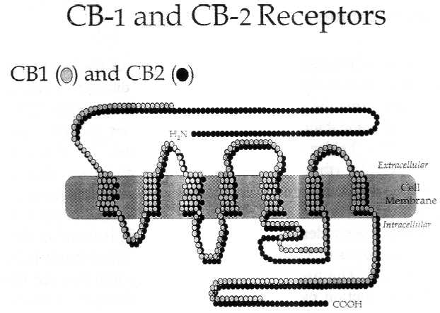 · The most far-reaching of the recent advances in cannabinoid biology are the identification of two types of cannabinoid receptors (CB1 and CB2) and of anandamide, a substance naturally produced by the body that acts at the cannabinoid receptor, and has effects similar to those of THC. The CB1 receptor is found primarily in the brain, and mediates the psychological effects of THC. The CB2 receptor is associated with the immune system, its role remains unclear.· The physiological roles of the brain cannabinoid system in humans are the subject of much active research, and not fully known; however, cannabinoids likely have a natural role in pain modulation, control of movement, and memory.
