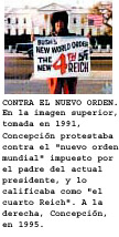 A través de los ojos curiosos y la cámara al hombro de Michael Moore, millones de personas en todo el mundo están conociendo estos días interioridades sorprendentes de la Administración Bush: los entramados empresariales que presionan al establishment, las amistades peligrosas de los hombres más poderosos del planeta... Aparte de esto y mucho más, Fahrenheit 9/11 también está mostrando al mundo el rostro y la voz de la gallega que ostenta un récord extraofi cial de persistencia y fi delidad a un puñado de causas. Se llama Concepción Martin Picciotto (Conchita para los amigos, Connie en versión anglosajona), nació en Santiago y se crió en Vigo, tiene 59 años y lleva 23 apostada en una acera frente a la Casa Blanca. Su manifestaciónvigilia no ha decaído desde 1981 hasta la actualidad. Durante este periodo, en la poltrona del Despacho Oval se han sentado cuatro presidentes, a saber: Ronald Reagan, George Bush, Bill Clinton y George W. Bush.