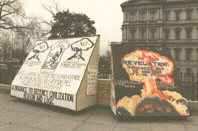 Early on March 11, 1983, the signs were in front of the Old Executive Office Building, where Plaintiff and his fellow Vigiler Concepcion Picciotto had spend every night of the winter -- rain, snow, and cold -- outside with the signs to insure that they would be on the sidewalk during the day.