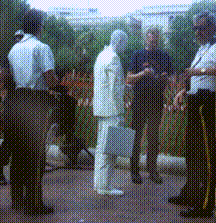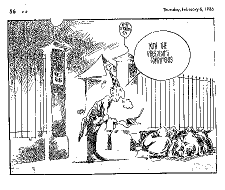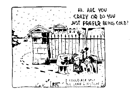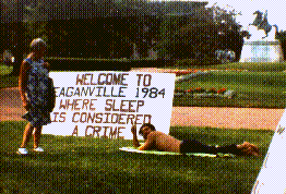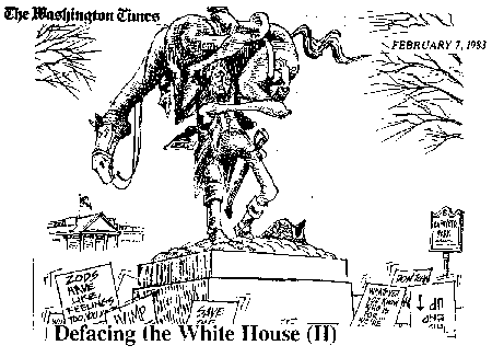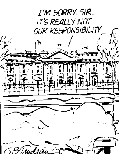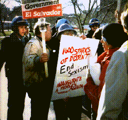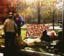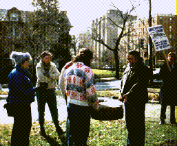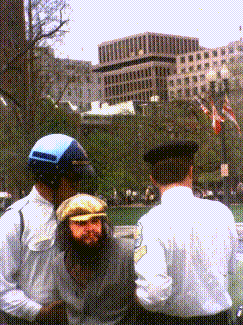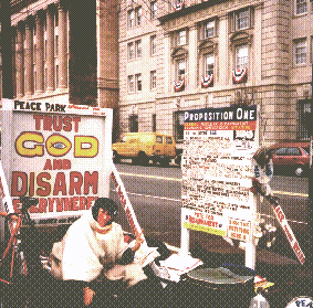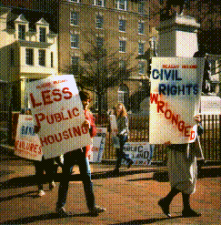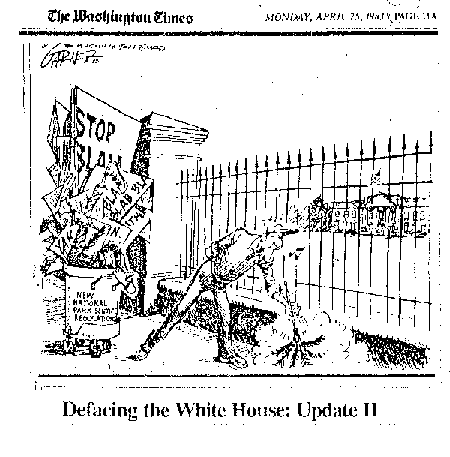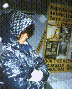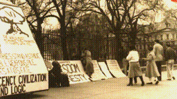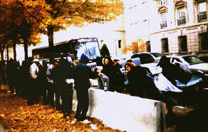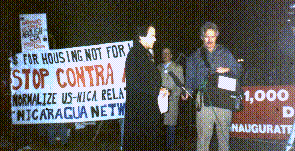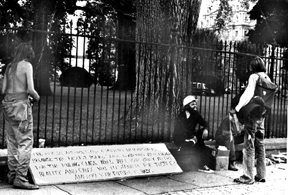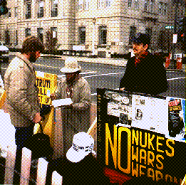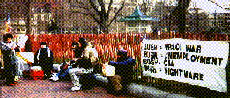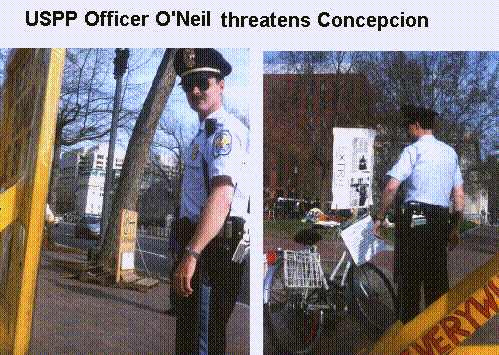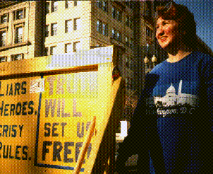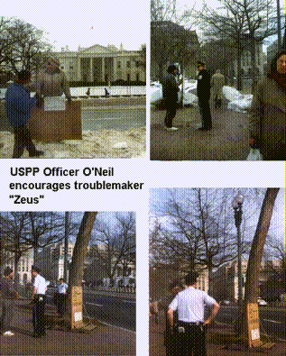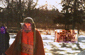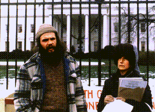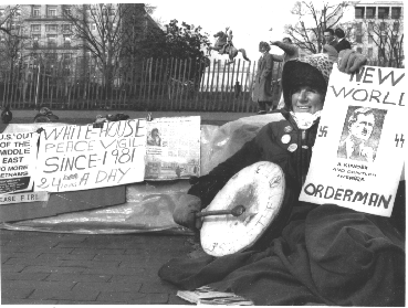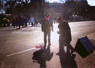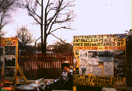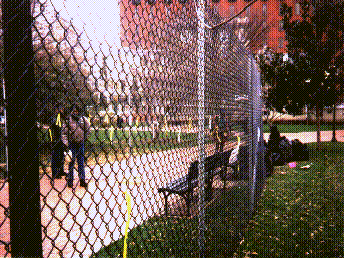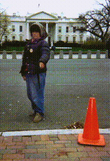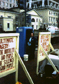 We heard rumors that Pennsylvania Avenue will reopen to vehicle traffic after the W Bush inauguration. Architect Carl Warnke, who redesigned Lafayette Park for Jaqueline Kennedy in the 1960's, has been asked by the Secret Service to do another redesign with a tunnel under the old street, and flowerbeds where police cruisers now lurk. He said to Ellen on June 2, 2001, that he hopes to create an historic atmosphere in and around the park, with people dressed in period costumes, horse-and-buggy rides, street theater, etc. - for and by the people. Perhaps this will happen. Whether or not, perhaps the police will be less inclined to behave as if they have exclusive domain. Perhaps George W. Bush will be tolerant. Perhaps you will help the new President, as well as the Representatives and Senators, to recognize the importance of protecting free expression outside the White House, and to seriously address the issues being raised by the vigilers day and night.