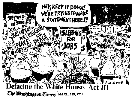 the park, or (yes!) move their stuff out of the park and into Pennsylvania Avenue. There seemed to be no logic or law to support some of the demands. Yet they usually prevail.
