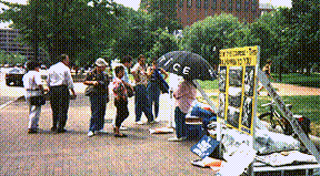 She survives. she says, on coffee, sweet rolls, and bread. Occasionally, friends bring her cheese, fruit, and sandwiches. She uses the restroom at a nearby Hardy's restaurant and showers infrequently at a downtown shelter for the homeless. She averages three hours of sleep a day, leaning against one of her signs.
