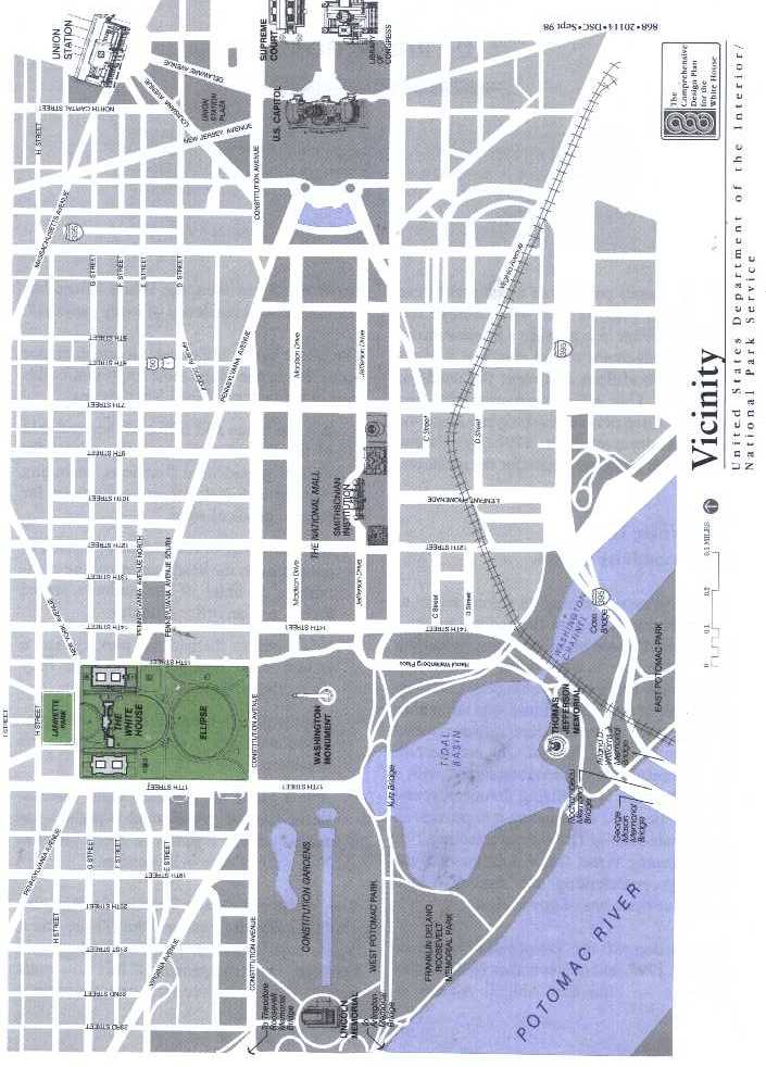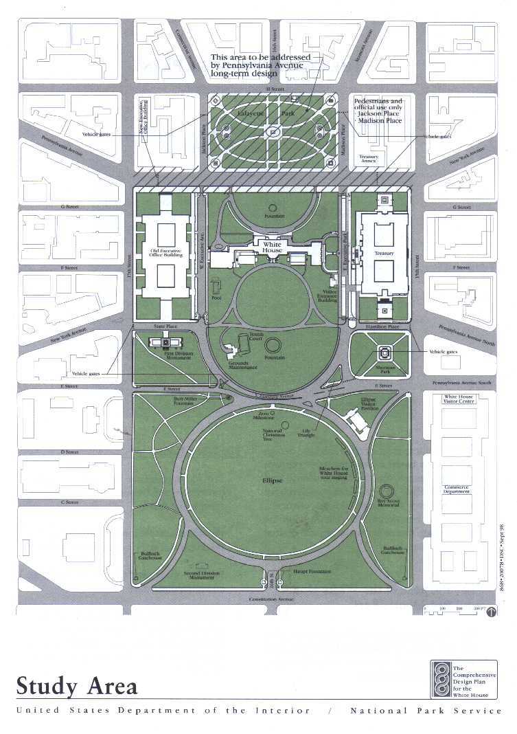 1.Site elements from earlier significant planning efforts will be respected and conserved, including the classical 18th century forms that are inherent to the layout of President's Park and the city of Washington, D.C. All components of President's Park are designed historic landscapes, and the Secretary of the Interior's standards for Historic Preservation will be followed in the management and treatment of these landscapes. 2. The distinct character of each of the site's three areas Lafayette Park, the White House and the Ellipse - will be respected, white recognizing that together these areas function as a significant - design element in the layout of Washington, D.C. 3. The design vocabulary and palette for the site will complement and articulate the dignity and importance of the resource, drawing from the existing appropriate architecture and landscape architecture in and around the site. To this end, proposed elements will respect the size, scale, mass, proportion, and the spatial relationships between them. 4. The traditional vistas from the White House to the north and south, as well as vistas toward the White House, will be respected of all times. 5. All designs will incorporate sound environmental, principles and environmentally and economically beneficial resource management technologies and practices. 6. The quality of the pedestrian experience will remain a high priority in all designs. 7. The needs to accommodate service security, and ceremonial functions will be met in a manner that is consistent with the dignity and importance of the site. 8. Neither security nor aesthetics will be compromised by actions on site. 9. Design elements that communicate appropriate visual quality, continuity and consistency will define the boundaries of President's Park and will create a specific identity for the park, but will also complement the design qualities of adjacent areas. * Materials used on the she will be compatible will its unique character. To this end all items used in the park --- benches, stonework grillwork, fences, light posts, and other elements --- will relate to the whole and will relate to the whole and will complement the overall District of Columbia federal park system.