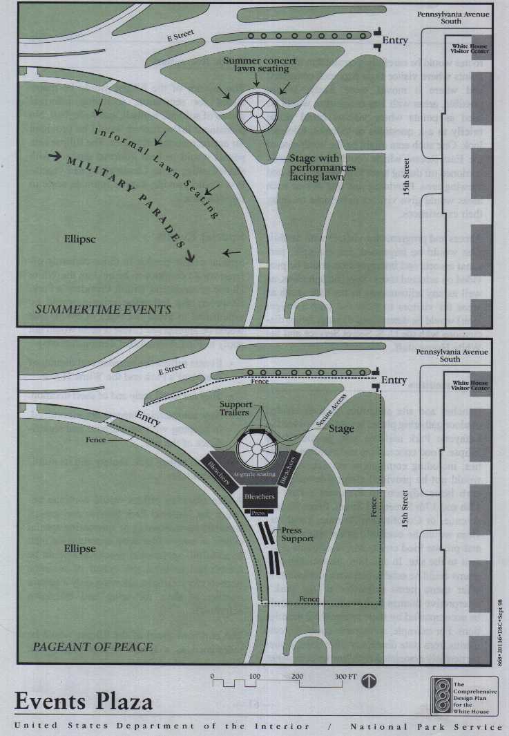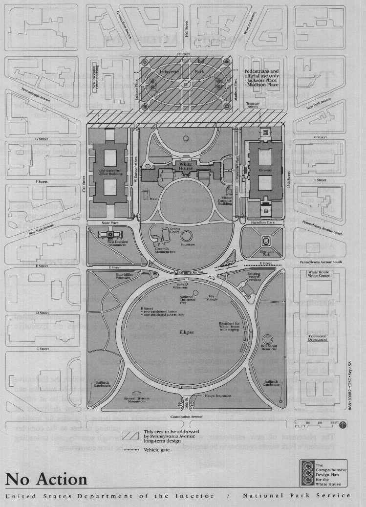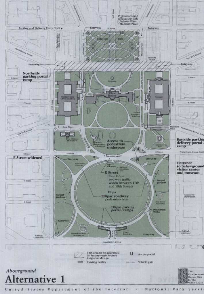 (3) For other staff an 850-space, two-level parking facility would be developed under the northern end of the Ellipse, as described for the proposed plan. To preserve the integrity of the original Ellipse design and the vista, vehicle access would be through two portals south of the Ellipse roadway (one on either side of 16th Street and accessible from Constitution Avenue).