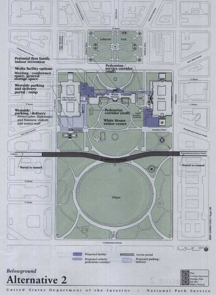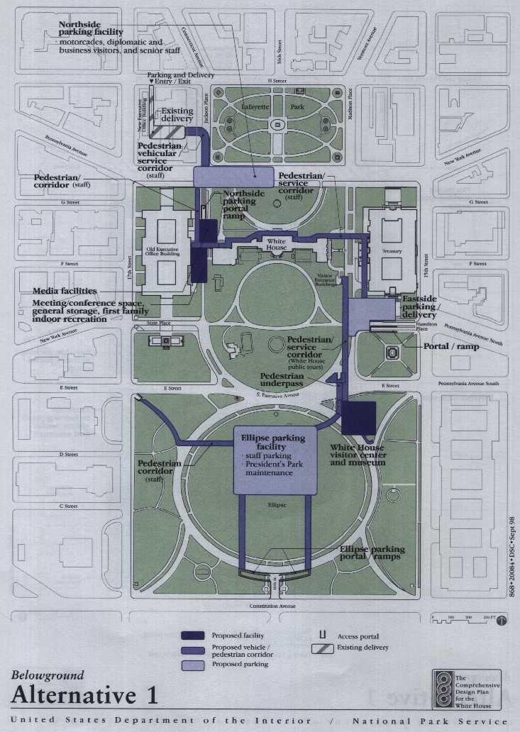 (1) On the north side a 290-space under-ground parking facility would be provided beneath Pennsylvania Avenue for motorcades, diplomatic visitors, business visitors, and senior White House staff, as described for the proposed plan. Vehicle access would be through an unobtrusive portal on the north side of West Executive Avenue (placed so as to maintain surface access to Pennsylvania Avenue) and through the New Executive Office Building.