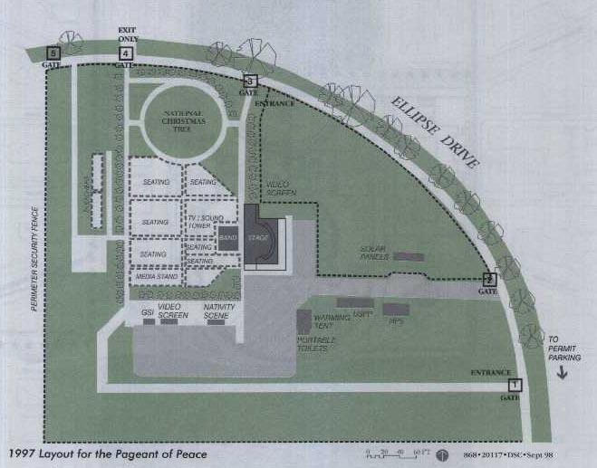 between 15th and 17th Streets. The presidential reviewing box is constructed in front of the White House, and media stands are constructed on the opposite side of the street on the sidewalk and within Lafayette Park.