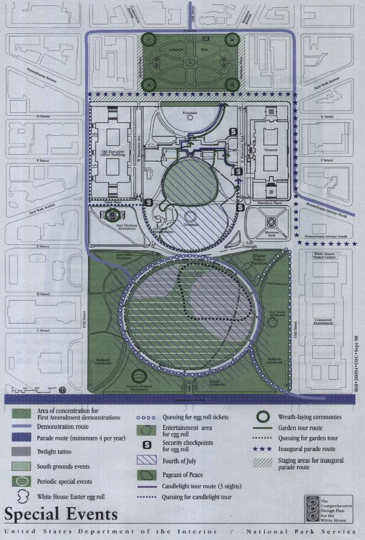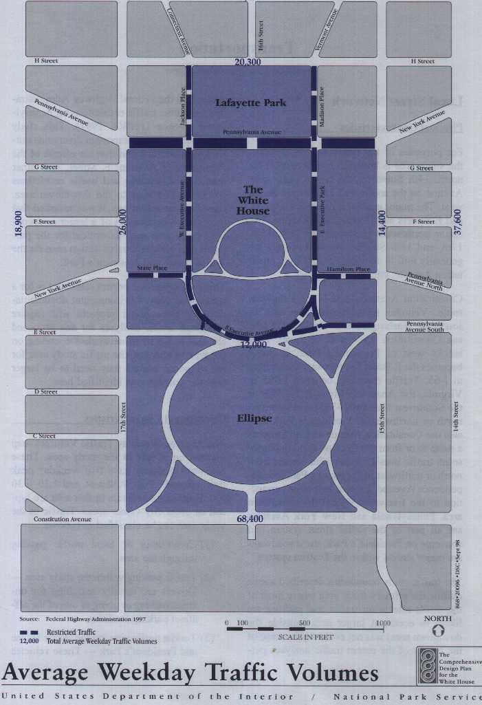 (4) Traffic accessing the Old Executive Office Building, the Treasury Building, or the White House - This group typically uses various access routes and proceeds to either East Executive Park or West Executive Avenue for entrance into the secured area. Pennsylvania Avenue is the major access route to the north side of the White House. There is no set circulation pattern.