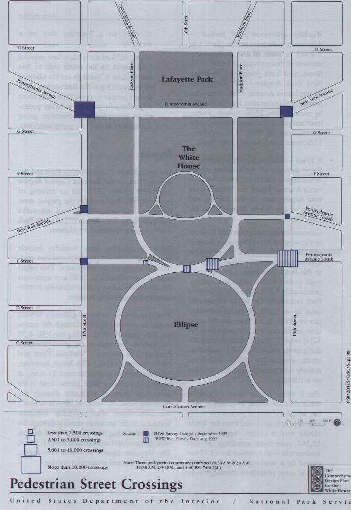 Crosswalks are designated on E Street to the west of West Executive Avenue and East Executive Park. On weekdays approximately 1,660 pedestrians cross at the West Executive Avenue crosswalk during a 12-hour period, and approximately 5,870 at the East Executive Park crosswalk. On White House tour days up to 5,000 additional crossings can be made. In addition, for the same time period, about 3,510 pedestrians (or 32%) cross E Street without using the designated crosswalks (BRW pedestrian count, August 26, 1997). Pedestrian activity was greater on a Saturday than on a Tuesday.