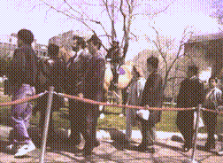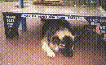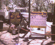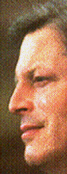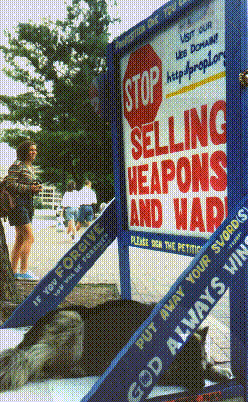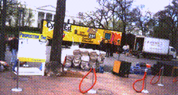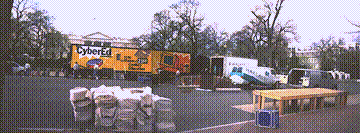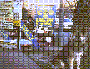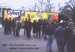As Mr. Gore was descending the stage to go into the Cyber-Ed truck, he looked twice at our new sign. Ellen thinks he was reading 'Stop Selling Weapons and War.' Thomas thinks his eye was caught by the Web address."