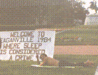 sign which read "Welcome to Reaganville 1984, where sleep is