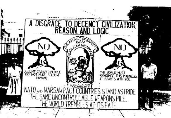 Concepcion and Thomas tend their messages night and day. These messages line the side walk farina the White House, signs of all sizes and shapes, in various colors, with drawings of the mushroom cloud or skulls. Angled side, the signs stand like a moral Maginot Line resisting the White House.